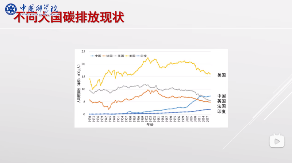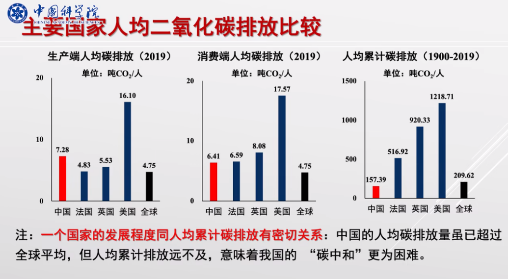 從主要發(fā)達(dá)國家的碳排放與經(jīng)濟(jì)增長的歷史關(guān)系看,一個國家的發(fā)展程度同人均累計碳排放密切相關(guān),就我國而言,人均累計碳排放遠(yuǎn)遠(yuǎn)低于主要發(fā)達(dá)國家,也小于全球平均。我們追求2060年達(dá)到碳中和,其難度遠(yuǎn)大于發(fā)達(dá)國家。