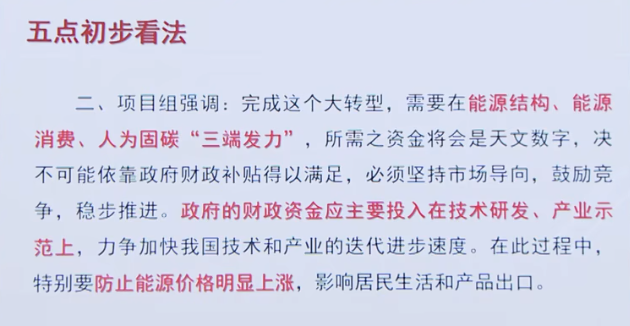 2、這輪“大轉(zhuǎn)型”需要在能源結(jié)構(gòu)、能源消費、人為固碳“三端發(fā)力”,所需資金將會是天文數(shù)字,決不可能依靠政府財政補(bǔ)貼得以滿足,必須堅持市場導(dǎo)向,鼓勵競爭,穩(wěn)步推進(jìn)。政府的財政資金應(yīng)主要投入在技術(shù)研發(fā)、產(chǎn)業(yè)示范上,力爭使我國技術(shù)和產(chǎn)業(yè)的迭代進(jìn)步快于他國。在此過程中,特別要防止能源價格明顯上漲,影響居民生活和產(chǎn)品出口。