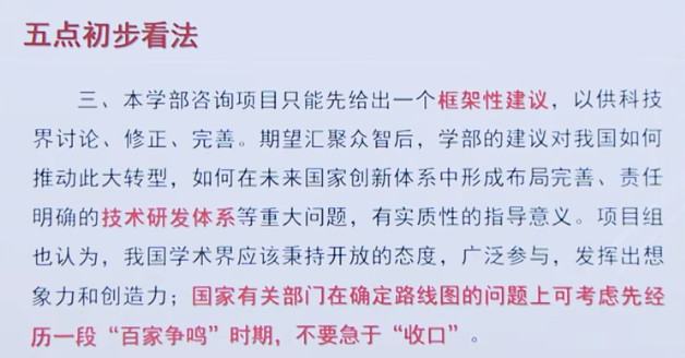 3、本學(xué)部咨詢項目只能先給出一個框架性建議,以供科技界討論、修正、完善。期望匯聚眾智后,學(xué)部的建議對我國如何推動此大轉(zhuǎn)型,如何在未來國家創(chuàng)新體系中形成布局完善、責(zé)任明確的研發(fā)體系等重大問題,有實質(zhì)性的指導(dǎo)意義。項目組認(rèn)為,我國學(xué)術(shù)界應(yīng)該秉持開放的態(tài)度,廣泛參與,發(fā)揮出想象力和創(chuàng)造力;國家有關(guān)部門在確定路線圖的問題上可考慮先經(jīng)歷一段“百家爭鳴”時期,不要急于“收口”。