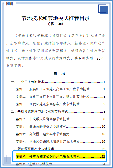 2022年1月28日,國家自然資源部辦公廳印發(fā)《節(jié)地技術(shù)和節(jié)地模式推薦目錄(第三批)》的通知,公布“預(yù)應(yīng)力構(gòu)架式風(fēng)電塔節(jié)地技術(shù)”為新能源環(huán)保產(chǎn)業(yè)節(jié)地技術(shù)。