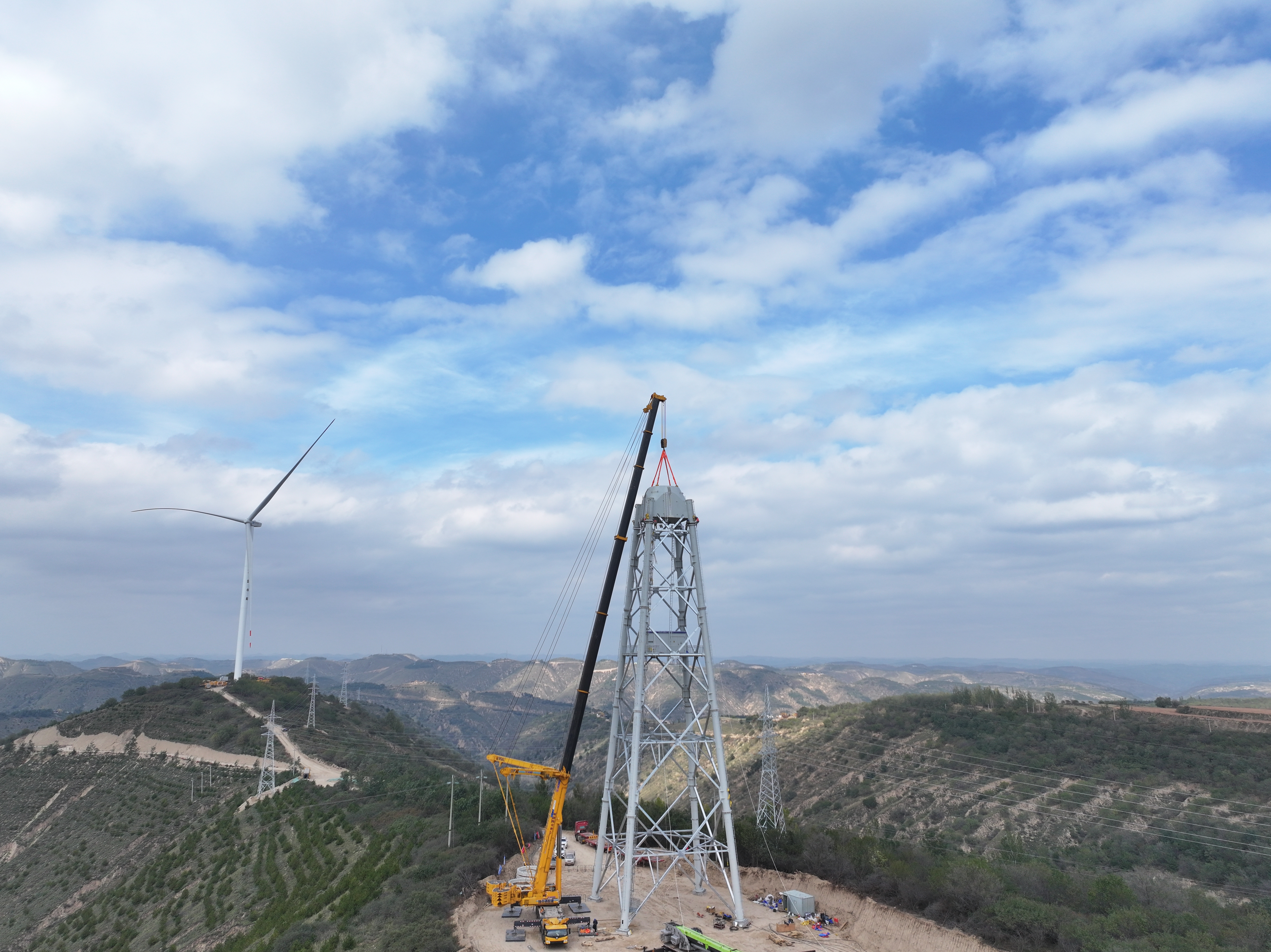 在施工作業(yè)現(xiàn)場,經(jīng)過多日的艱苦奮戰(zhàn),首臺(tái)構(gòu)架式風(fēng)塔塔架及過渡段部分全部吊裝完成,這一里程碑式的進(jìn)展,標(biāo)志著項(xiàng)目進(jìn)入了一個(gè)新的階段。