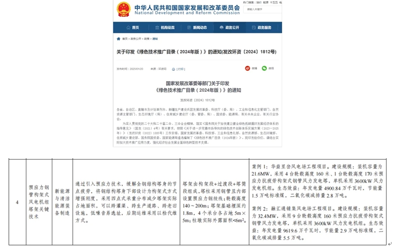 2025年1月,國家發(fā)展改革委聯(lián)合科技部等八部門發(fā)布《綠色技術(shù)推廣目錄(2024年版)》,聚焦節(jié)能降碳、環(huán)境保護、資源循環(huán)利用等七大領(lǐng)域,系統(tǒng)收錄112項先進技術(shù)。與2020年版相比,新版目錄首次要求每項技術(shù)附應(yīng)用案例及生態(tài)效益數(shù)據(jù),為企業(yè)提供可復(fù)制的落地模板。其中,青島華斯壯能源科技有限公司研發(fā)的預(yù)應(yīng)力鋼管構(gòu)架式風(fēng)電機組塔架技術(shù)成功入選。