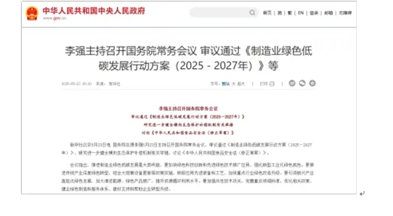 5月23日,他主持召開國務(wù)院常務(wù)會議審議通過《制造業(yè)綠色低碳發(fā)展行動方案(2025-2027年)》,強調(diào)“加快綠色科技創(chuàng)新和先進綠色技術(shù)推廣應(yīng)用”,要求傳統(tǒng)產(chǎn)業(yè)結(jié)合設(shè)備更新政策推進綠色改造,新興產(chǎn)業(yè)則需高起點推廣清潔能源與資源循環(huán)利用。