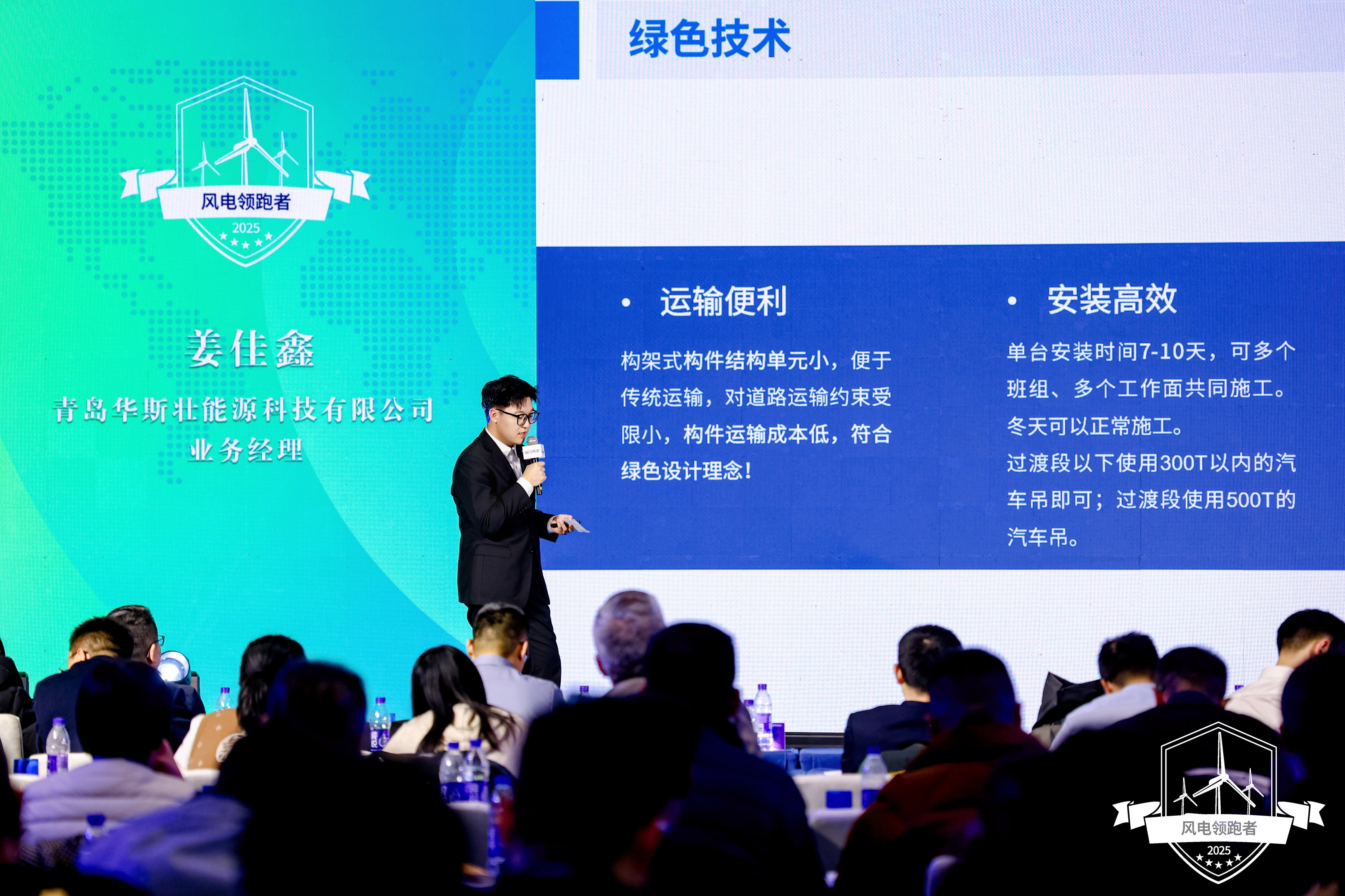 在論壇主題演講環(huán)節(jié),華斯壯業(yè)務(wù)經(jīng)理姜佳鑫受邀登臺,以《技術(shù)驅(qū)動創(chuàng)新,品質(zhì)引領(lǐng)未來》為主題,深入分享了公司在風(fēng)電塔架技術(shù)領(lǐng)域的探索成果與實戰(zhàn)經(jīng)驗,引發(fā)全場廣泛關(guān)注。在風(fēng)電產(chǎn)業(yè)邁向“大型化、場景化、智能化”的今天,傳統(tǒng)塔架技術(shù)在山地、高寒、跨溝渠等復(fù)雜環(huán)境下面臨著運輸難、建設(shè)成本高、環(huán)境適應(yīng)性不足等現(xiàn)實挑戰(zhàn)。華斯壯深耕風(fēng)電塔架領(lǐng)域多年,“預(yù)應(yīng)力構(gòu)架式風(fēng)電塔架技術(shù)”通過“構(gòu)架結(jié)構(gòu)+預(yù)應(yīng)力技術(shù)”的系統(tǒng)性創(chuàng)新,成功實現(xiàn)了輕量化、模塊化、節(jié)地性等核心突破,為行業(yè)提供了更高效、更經(jīng)濟、更綠色的塔架解決方案。