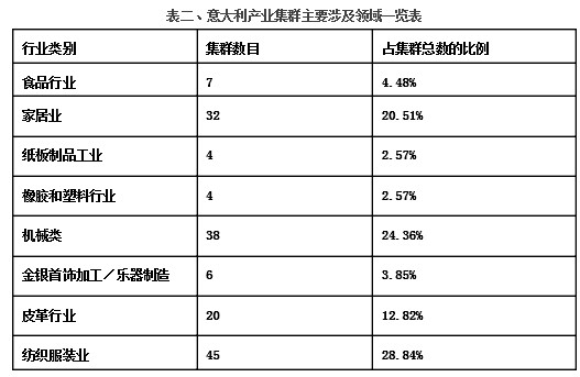 意大利的產(chǎn)業(yè)集群多集中在傳統(tǒng)輕工業(yè)領(lǐng)域,主要行業(yè)及所占比例見表二。
