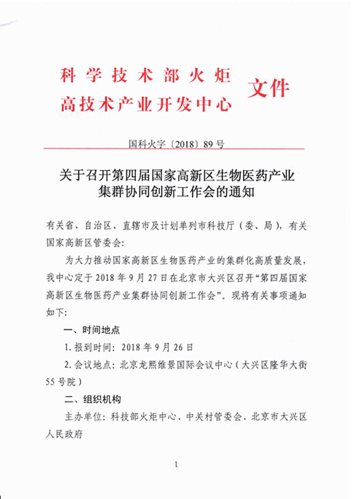 關于召開第四屆國家高新區(qū)生物醫(yī)藥產(chǎn)業(yè)集群協(xié)同創(chuàng)新工作會的通知