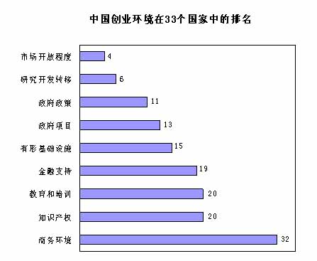 ?。?)創(chuàng)業(yè)環(huán)境總體仍處于非良好狀況。創(chuàng)業(yè)環(huán)境在創(chuàng)業(yè)環(huán)境條件框架的九個(gè)方面的綜合評(píng)分中仍然處于一般水平,排在第17位。沒有達(dá)到良好狀況。相對(duì)于發(fā)達(dá)國(guó)家,我國(guó)的創(chuàng)業(yè)環(huán)境是較差的;但是,相對(duì)于發(fā)展中國(guó)家,中國(guó)的創(chuàng)業(yè)環(huán)境較好。在創(chuàng)業(yè)環(huán)境條件框架的9個(gè)方面,中國(guó)相對(duì)好的方面是市場(chǎng)開放程度、研究開發(fā)轉(zhuǎn)移、政府政策和政府項(xiàng)目以及有形基礎(chǔ)設(shè)施;相對(duì)較差的是金融支持、教育和培訓(xùn)以及知識(shí)產(chǎn)權(quán)保護(hù),最差的方面是商務(wù)環(huán)境,即為創(chuàng)業(yè)提供服務(wù)的環(huán)境條件.