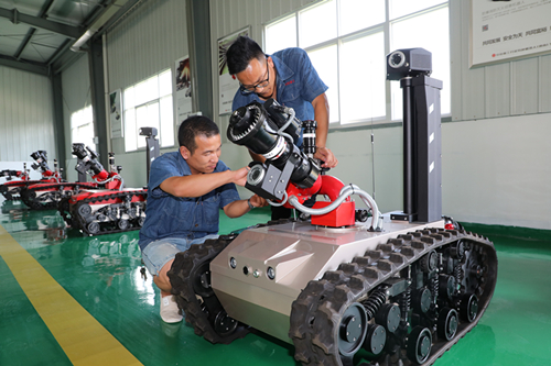 中信重工渭南基地的工人正在調(diào)試消防滅火機(jī)器人