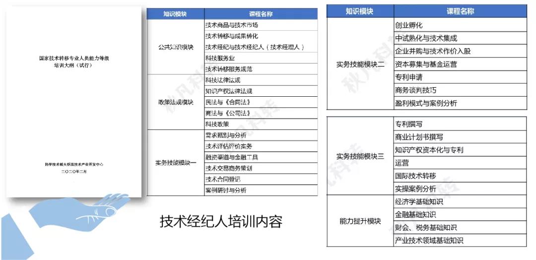 早在1997年,原國家科委就印發(fā)了《全國技術經(jīng)紀人培訓大綱》,隨后的二十幾年期間,北京、上海、江蘇等省市紛紛制訂了各自的培訓大綱。直到2020年3月,科技部火炬中心才對相關大綱進行了修訂,并發(fā)布了《國家技術轉(zhuǎn)移專業(yè)人員能力等級培訓大綱》(試行)。大綱融合新形勢下我國科技成果轉(zhuǎn)移轉(zhuǎn)化的新模式、新特點,注重理論與實踐相結(jié)合、國內(nèi)與國際相結(jié)合,突出科學性、系統(tǒng)性和實用性,所列內(nèi)容既包括不同層次技術轉(zhuǎn)移從業(yè)人員應知應會的知識結(jié)構(gòu)、經(jīng)紀實務、案例實操等培訓課程,也包括提升技術轉(zhuǎn)移從業(yè)人員知識素養(yǎng)的擴展性選修課程,為分類評價技術經(jīng)紀人,引導技術經(jīng)紀人職業(yè)化發(fā)展方向奠定了基礎。