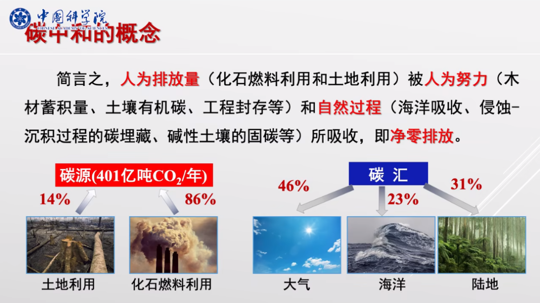 丁仲禮表示,“碳中和”是指化石燃料利用和土地利用的人為排放量被人為作用和自然過程所吸收,即實現(xiàn)凈零排放,“碳中和就是要想辦法把原本將會滯留在大氣中的二氧化碳減下來或吸收掉”。