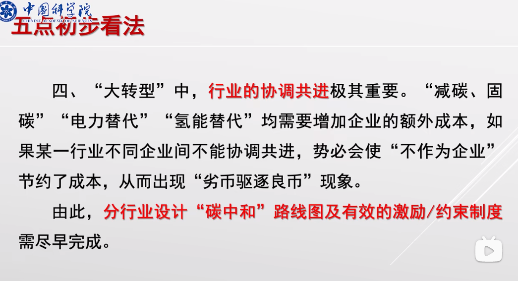 4、“大轉(zhuǎn)型”中,行業(yè)的協(xié)調(diào)共進(jìn)極其重要。“減碳、固碳”“電力替代”“氫能替代”均需要增加企業(yè)的額外成本,如果某一行業(yè)不同企業(yè)間不能協(xié)調(diào)共進(jìn),勢必會使“不作為企業(yè)”節(jié)約了成本,從而出現(xiàn)“劣幣驅(qū)逐良幣”現(xiàn)象。由此,分行業(yè)設(shè)計“碳中和”路線圖及有效的激勵/約束制度需盡早提上日程。