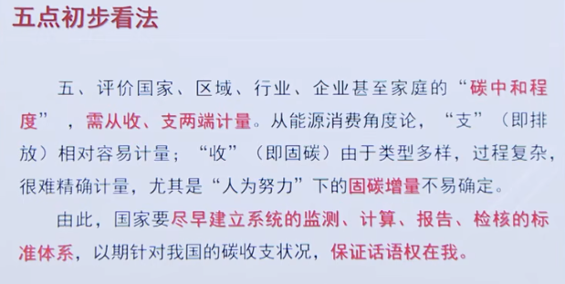 5、評價國家、區(qū)域、行業(yè)、企業(yè)甚至家庭的碳中和程度,需從收、支兩端計量。從能源消費角度論,“支”(即排放)相對容易計量;“收”(即固碳)由于類型多樣,過程復(fù)雜,很難精確計量,尤其是“人為努力”下的固碳增量不易確定。由此,國家應(yīng)盡早建立系統(tǒng)的監(jiān)測、計算、報告、檢核的標(biāo)準(zhǔn)體系,以期針對我國的碳收支狀況,保證話語權(quán)在我。