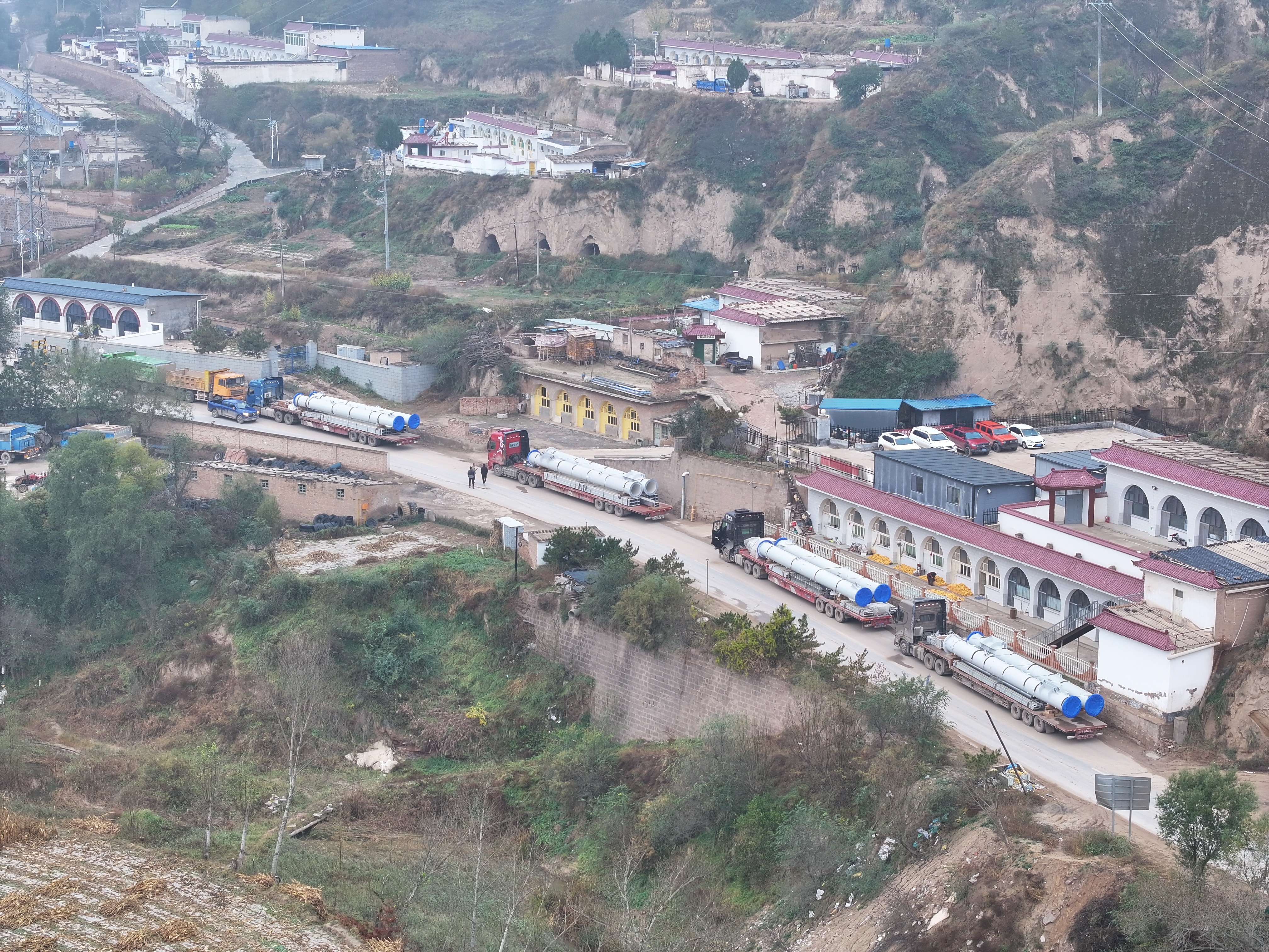 2、運(yùn)輸?shù)跹b,難于上青天。傳統(tǒng)塔筒分段超長(zhǎng)、超重,在狹窄、陡峭的山路上運(yùn)輸極為困難;同時(shí),吊裝過(guò)程需要超大平整作業(yè)平臺(tái),而山地機(jī)位大多空間有限,無(wú)法滿足這一核心需求,極大地制約了施工進(jìn)度。