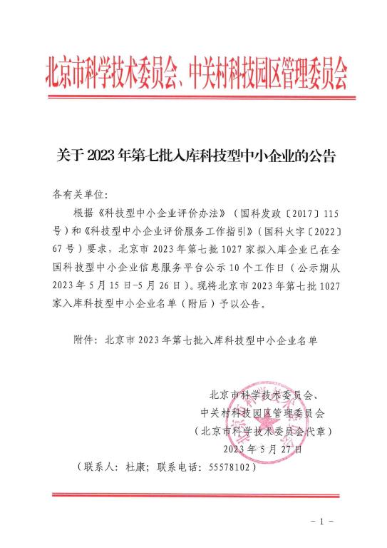 北京市2023年第7批入庫科技型中小企業(yè)名單公告