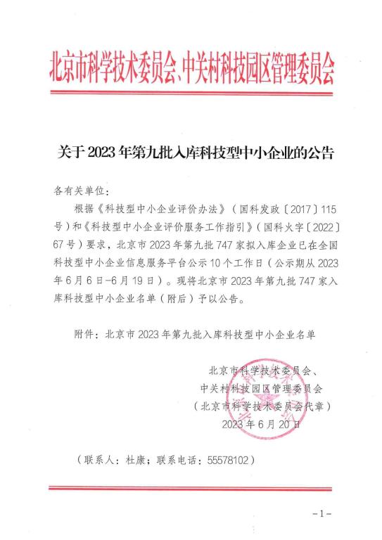 北京市2023年第9批入庫科技型中小企業(yè)名單公告