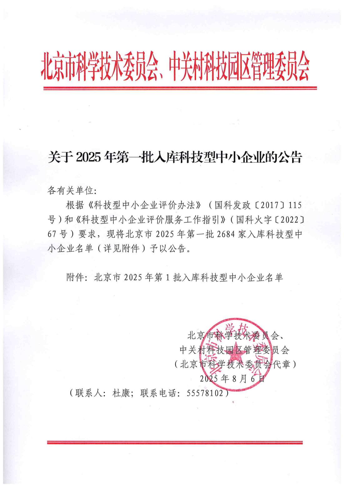 北京市2025年第1批入庫科技型中小企業(yè)名單公告