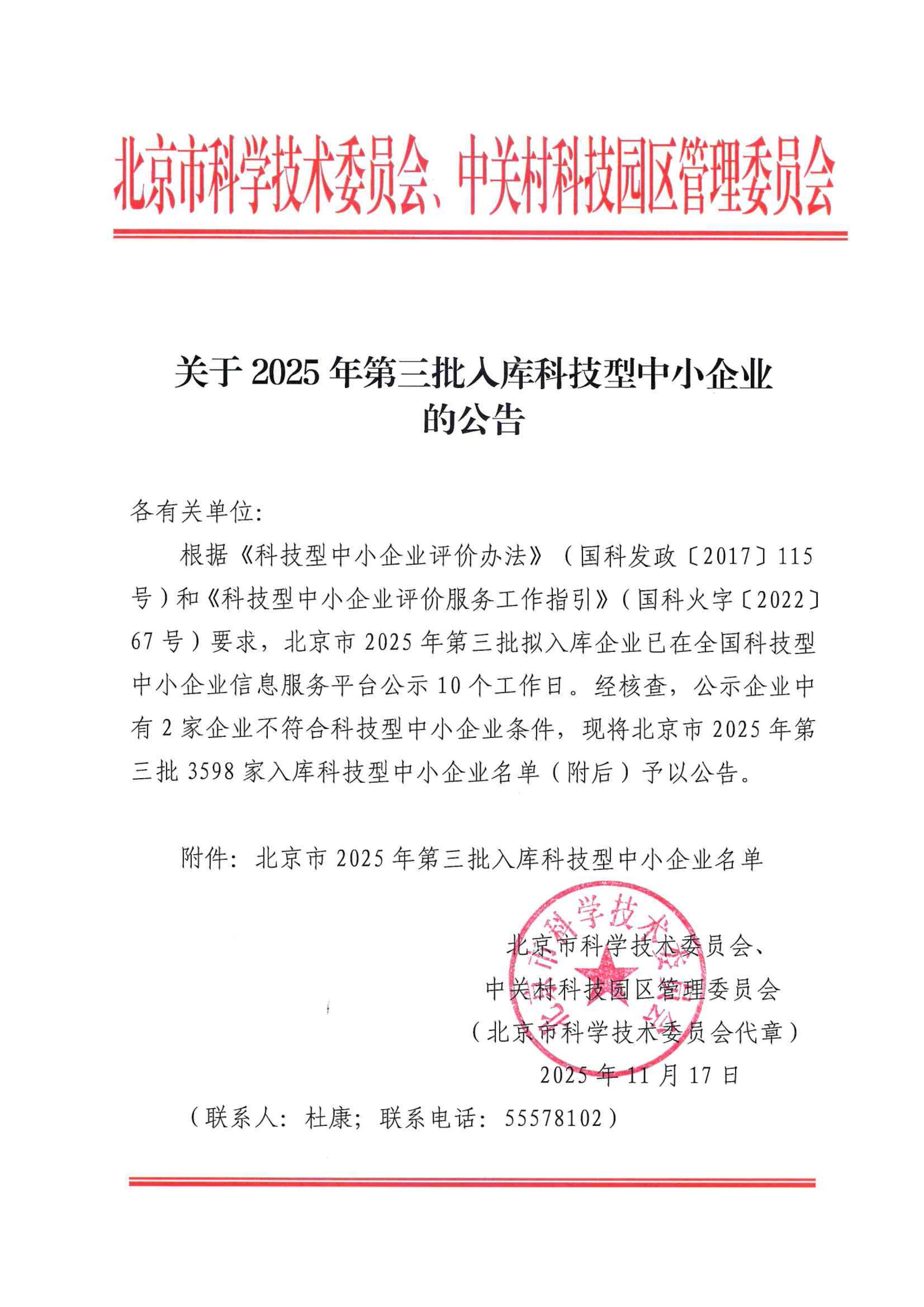 北京市2025年第3批入庫(kù)科技型中小企業(yè)名單公告