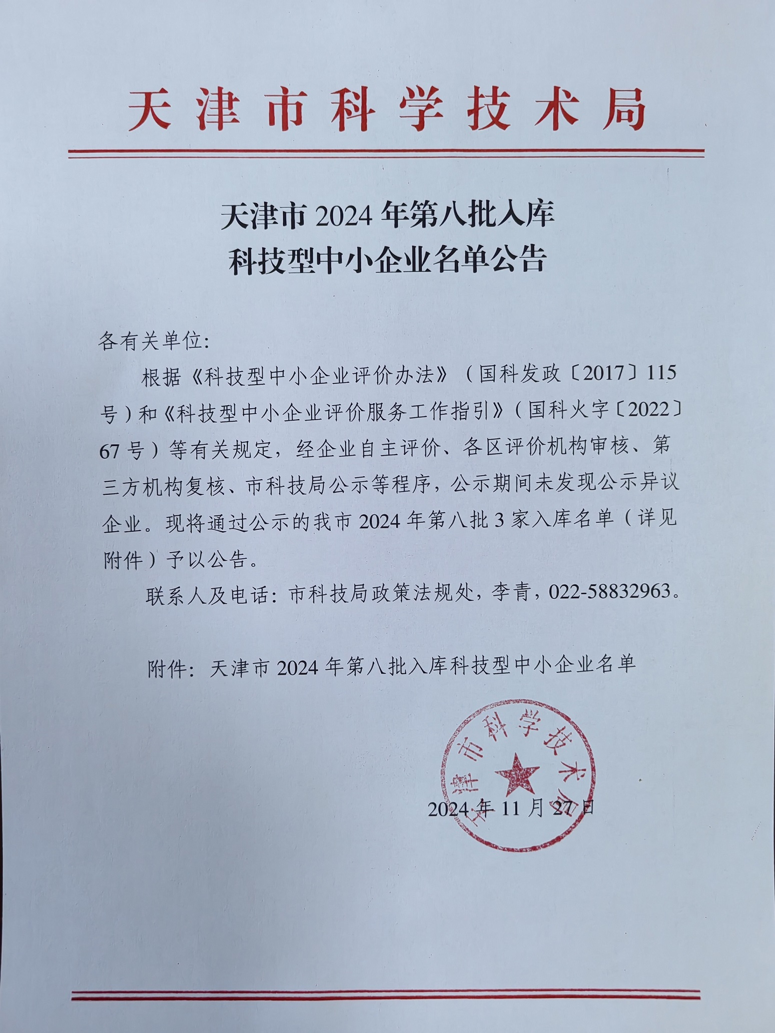天津市2024年第8批入庫科技型中小企業(yè)名單公告