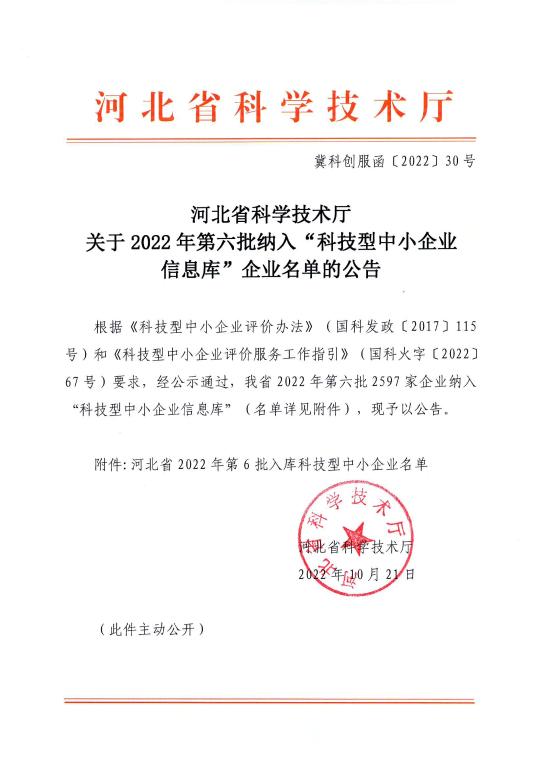 河北省2022年第6批入庫科技型中小企業(yè)名單公告