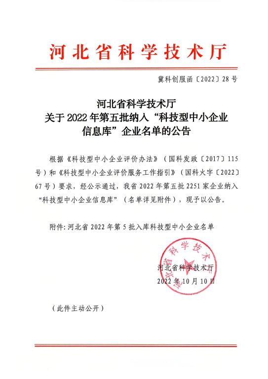 河北省2022年第5批入庫科技型中小企業(yè)名單公告