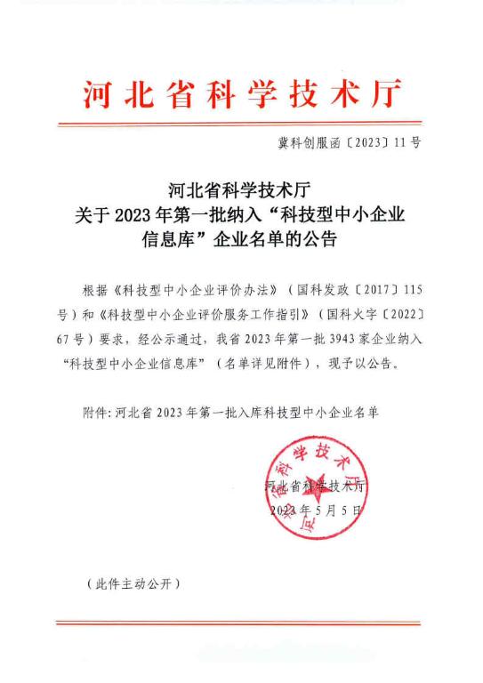 河北省2023年第1批入庫(kù)科技型中小企業(yè)名單公告正文.jpg PICTURE