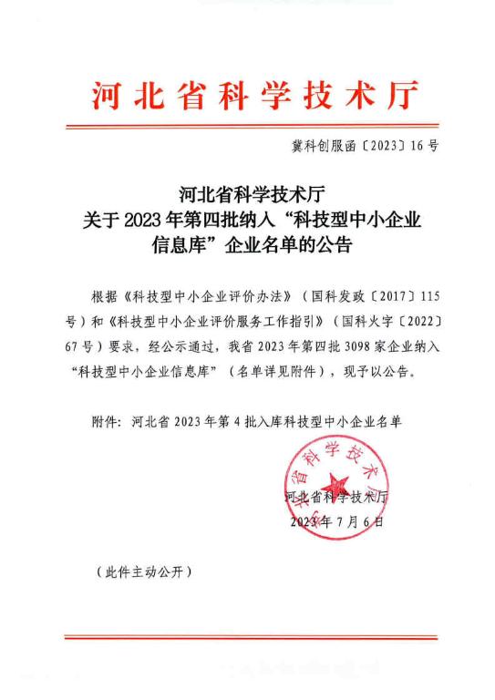 河北省2023年第4批入庫科技型中小企業(yè)名單公告