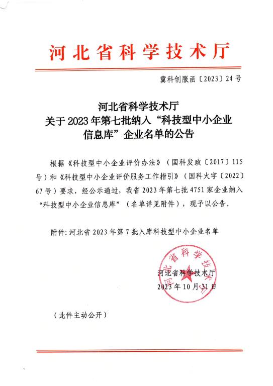 河北省2023年第7批入庫科技型中小企業(yè)名單公告