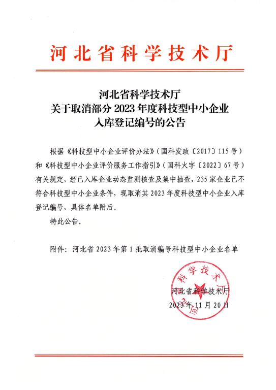 河北省2023年第1批撤銷編號科技型中小企業(yè)名單公告