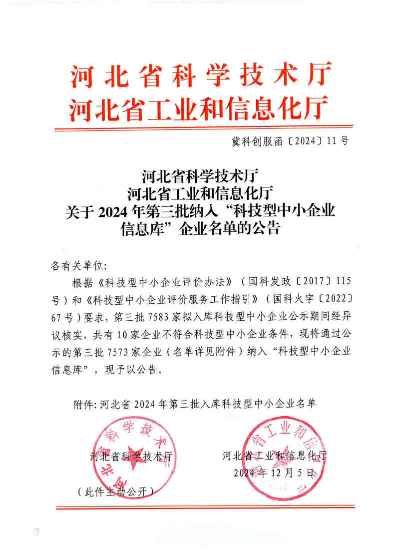 河北省2024年第3批入庫科技型中小企業(yè)名單公告
