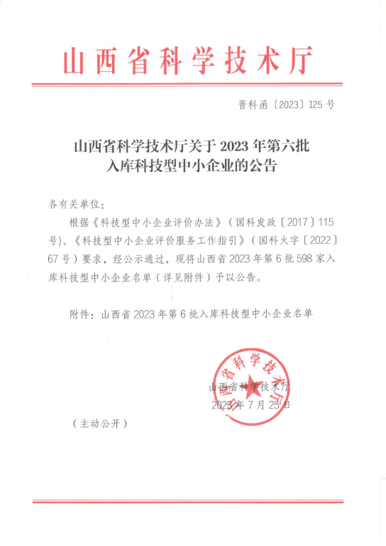 山西省2023年第6批入庫科技型中小企業(yè)名單公告