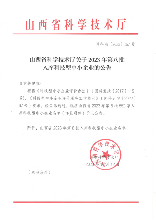 山西省2023年第8批入庫科技型中小企業(yè)名單公告