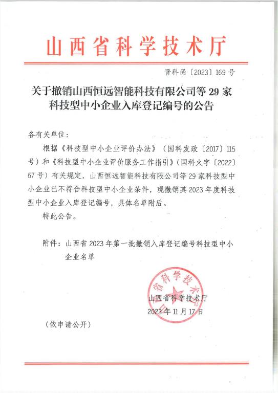 山西省2023年第1批撤銷編號科技型中小企業(yè)名單公告
