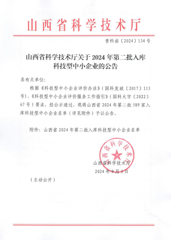 山西省2024年第2批入庫科技型中小企業(yè)名單公告