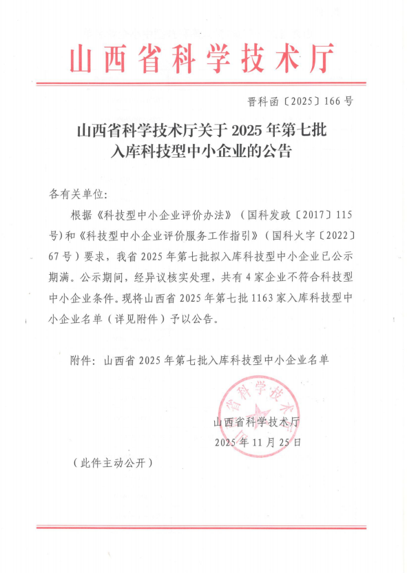 山西省2025年第7批入庫科技型中小企業(yè)名單公告
