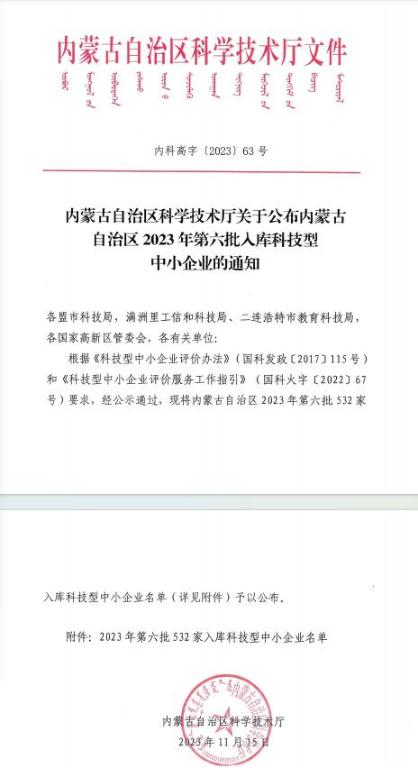 內(nèi)蒙古自治區(qū)2023年第6批入庫科技型中小企業(yè)名單公告
