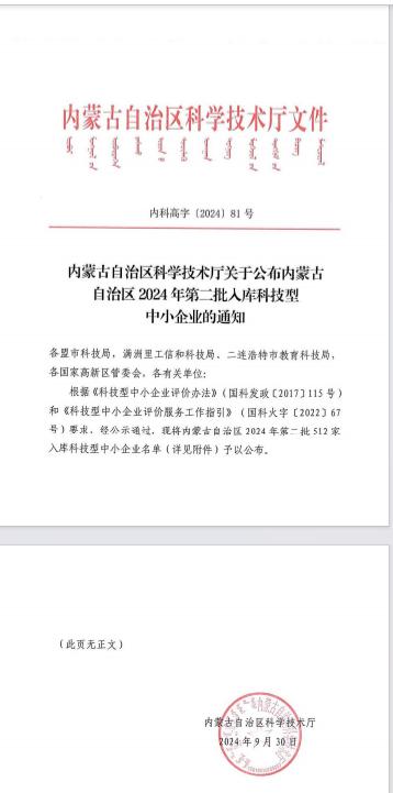 內(nèi)蒙古自治區(qū)2024年第2批入庫科技型中小企業(yè)名單公告
