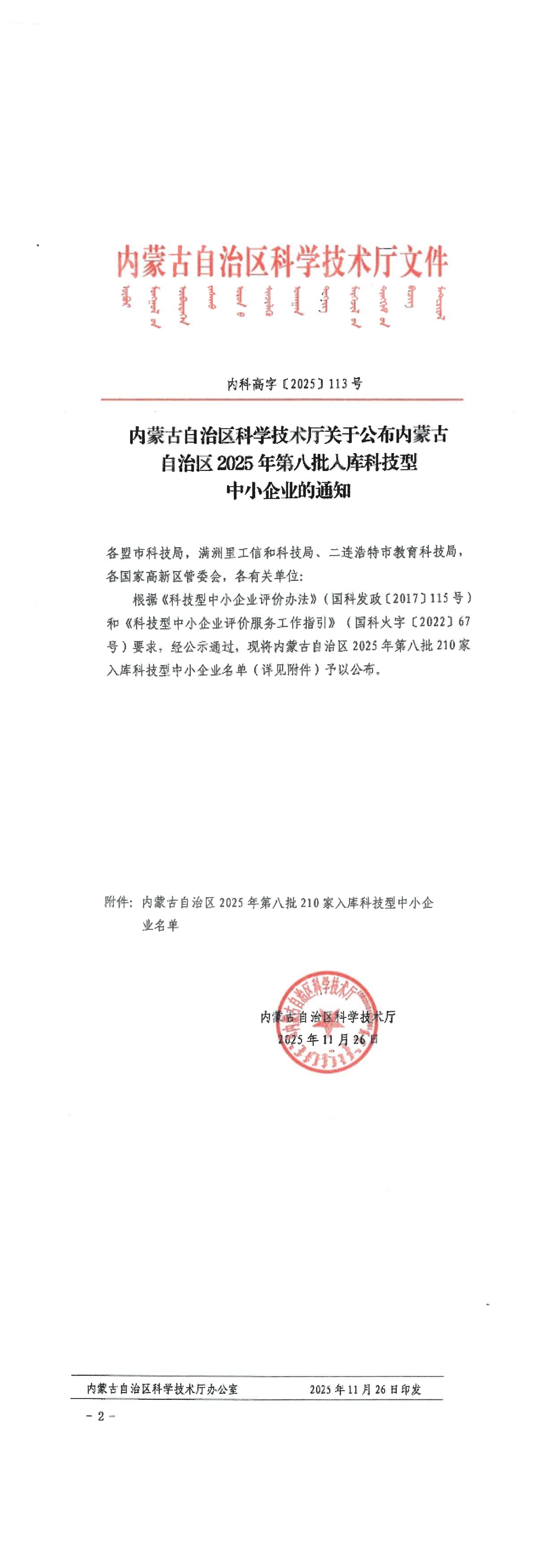 內(nèi)蒙古自治區(qū)2025年第8批入庫科技型中小企業(yè)名單公告