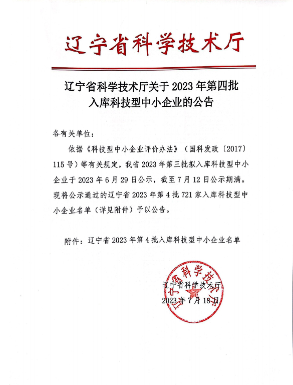 遼寧省2023年第4批入庫科技型中小企業(yè)名單公告