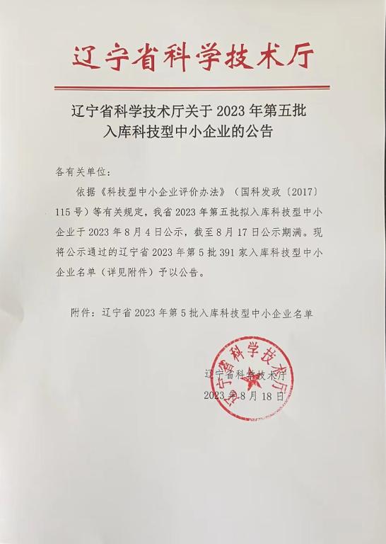 遼寧省2023年第5批入庫(kù)科技型中小企業(yè)名單公告正文.jpg PICTURE