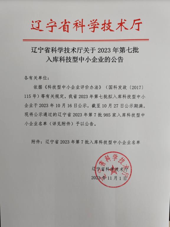 遼寧省2023年第7批入庫科技型中小企業(yè)名單公告