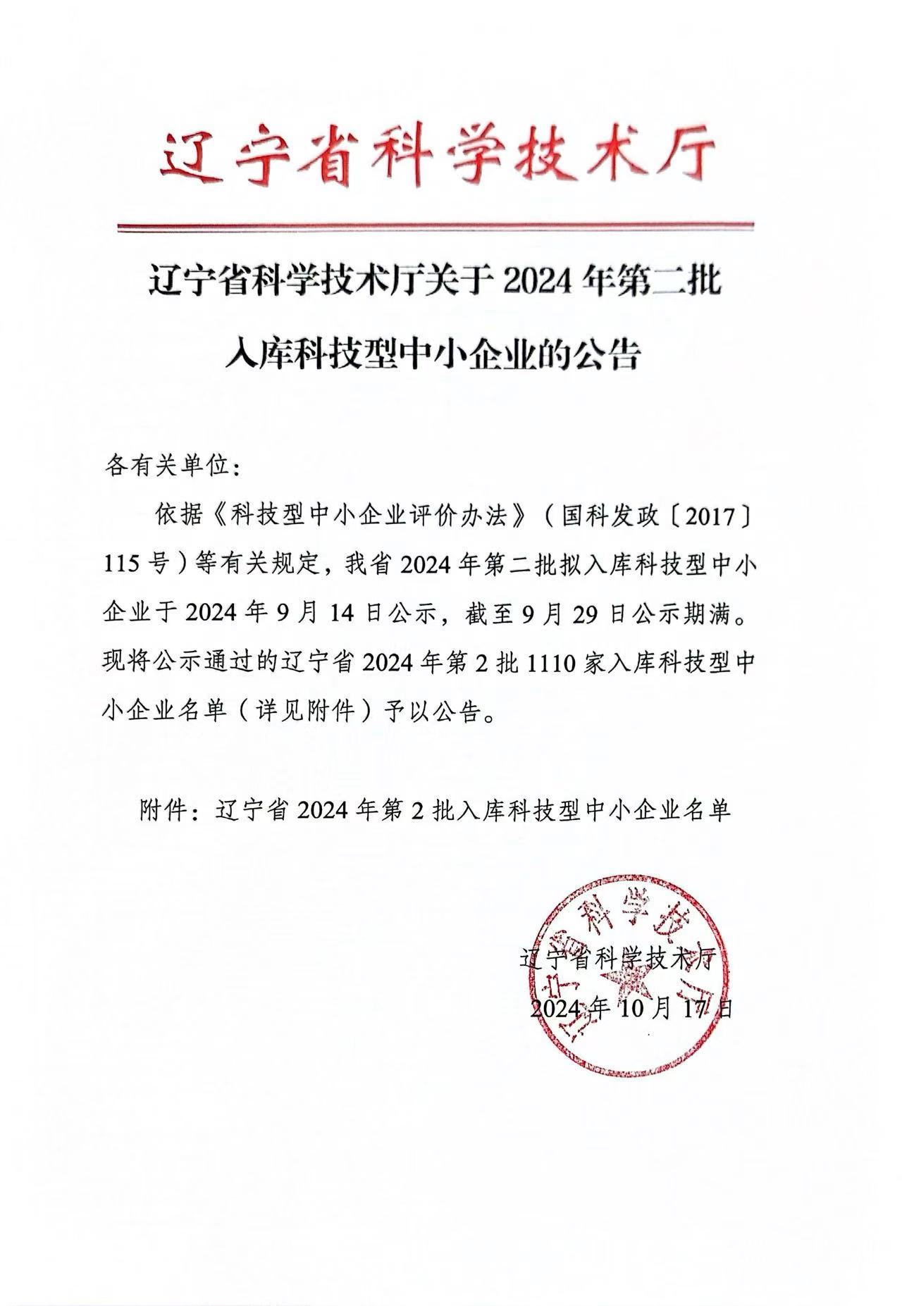 遼寧省2024年第2批入庫(kù)科技型中小企業(yè)名單公告正文.jpg PICTURE