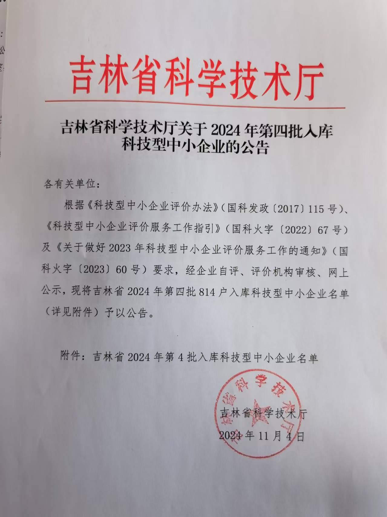吉林省2024年第4批入庫科技型中小企業(yè)名單公告