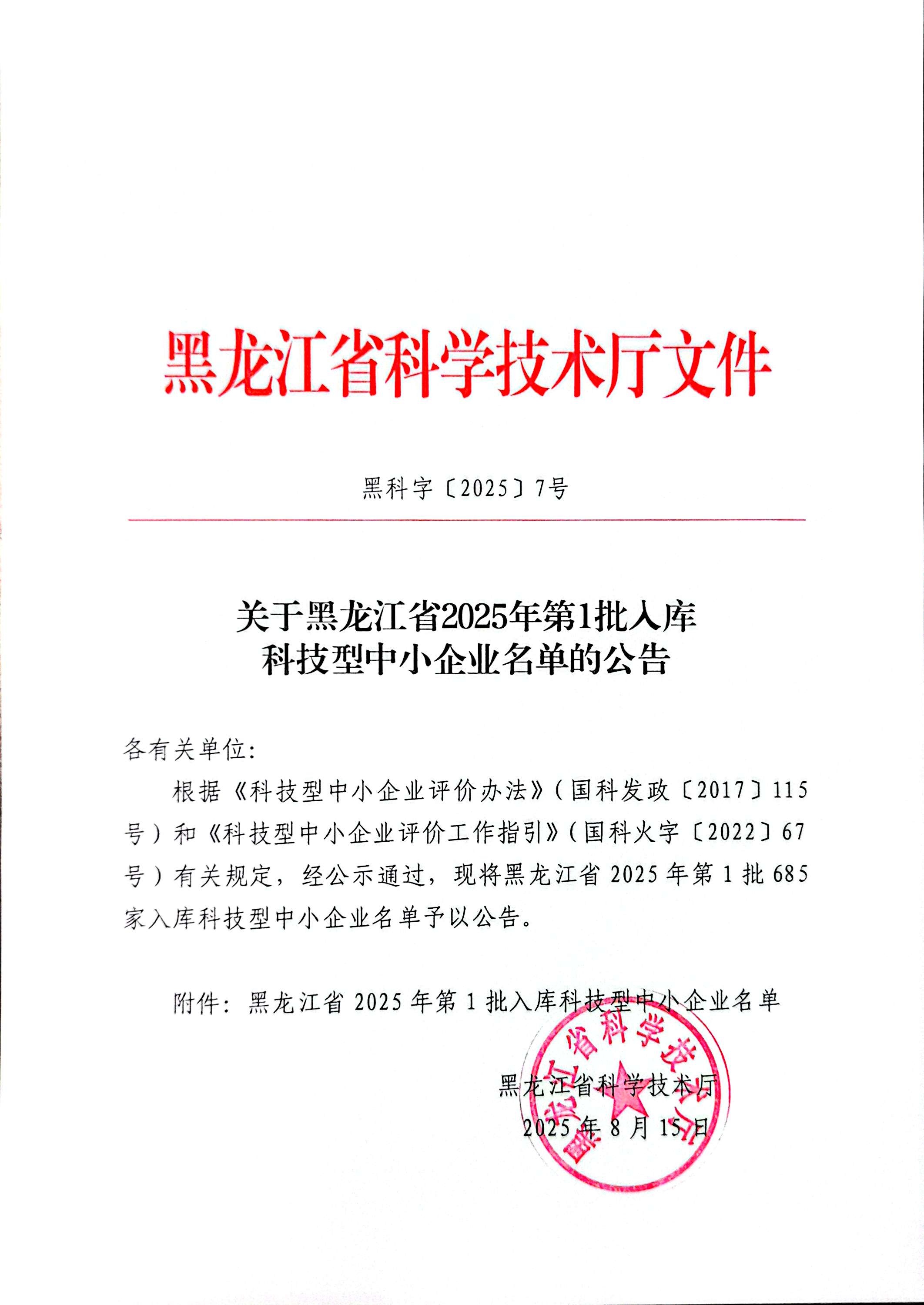 黑龍江省2025年第1批入庫(kù)科技型中小企業(yè)名單公告正文.jpg PICTURE