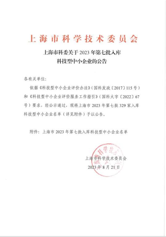 上海市2023年第7批入庫(kù)科技型中小企業(yè)名單公告正文.jpg PICTURE