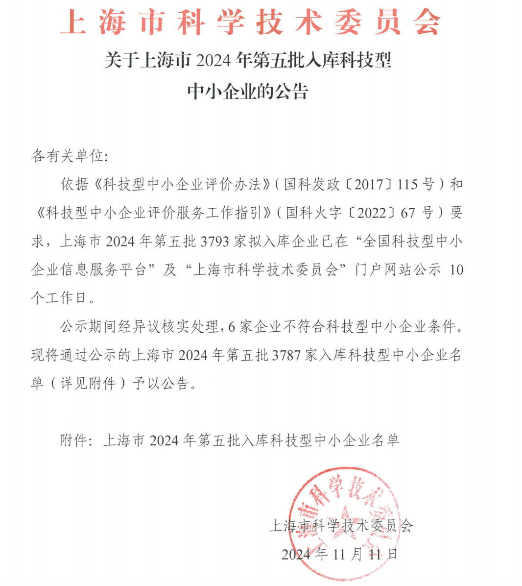 上海市2024年第5批入庫科技型中小企業(yè)名單公告