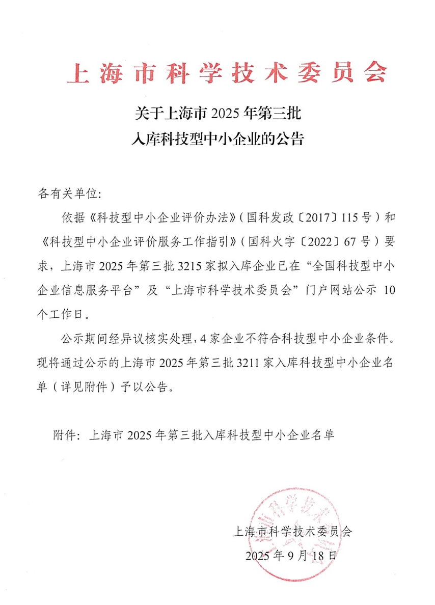 上海市2025年第3批入庫科技型中小企業(yè)名單公告