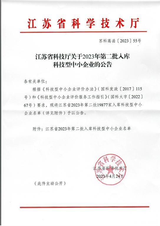 江蘇省2023年第2批入庫科技型中小企業(yè)名單公告
