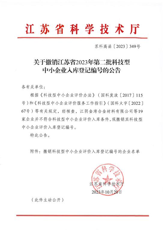 江蘇省2023年第2批撤銷編號科技型中小企業(yè)名單公告