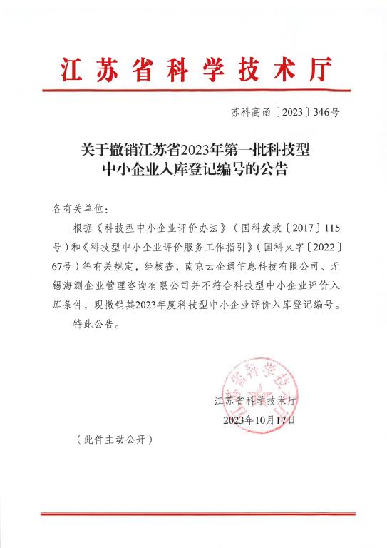江蘇省2023年第1批撤銷編號科技型中小企業(yè)名單公告