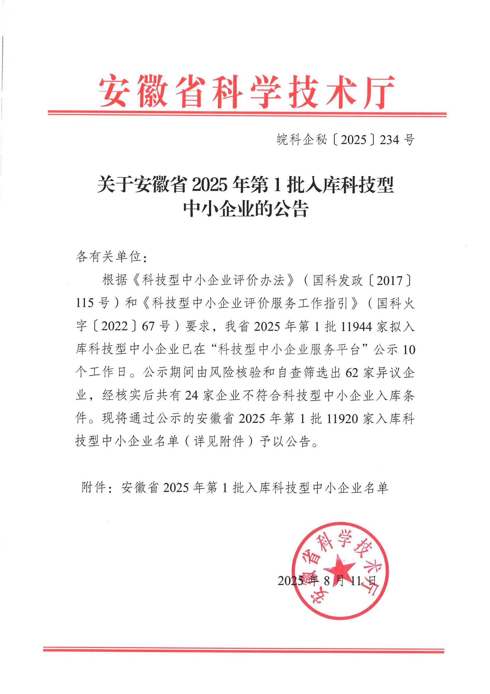 安徽省2025年第1批入庫(kù)科技型中小企業(yè)名單公告正文.jpg PICTURE